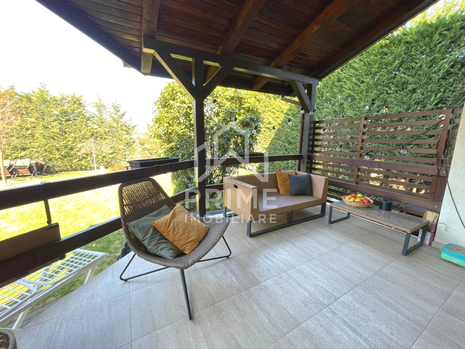 Curtea este frumos amenajată și oferă spațiu verde, intimitate și loc pentru relaxare. Terasa acoperită completează perfect zona exterioară, fiind ideală pentru serile petrecute alături de familie și prieteni.